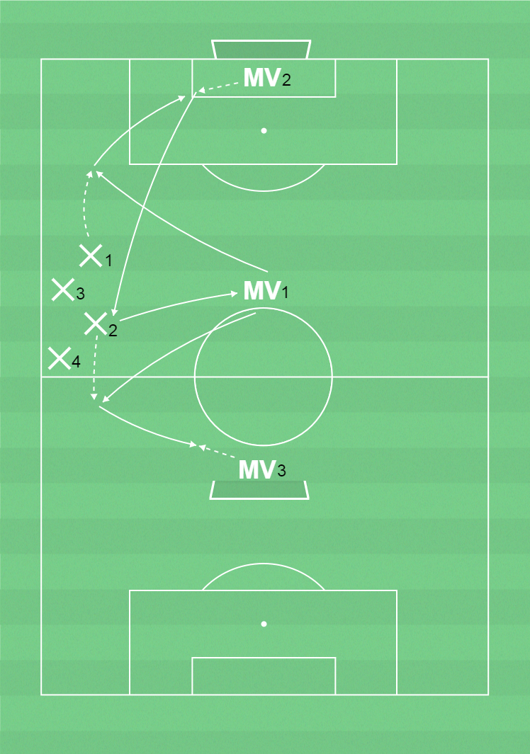 X2 passar till Mv3 som passar bollen med skruv till X3.