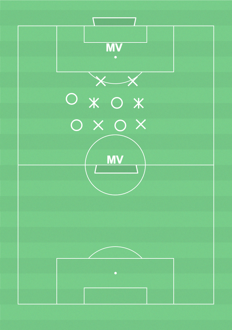 X, Y, Mv1 och Mv2 ska hålla bollen inom laget mot O.