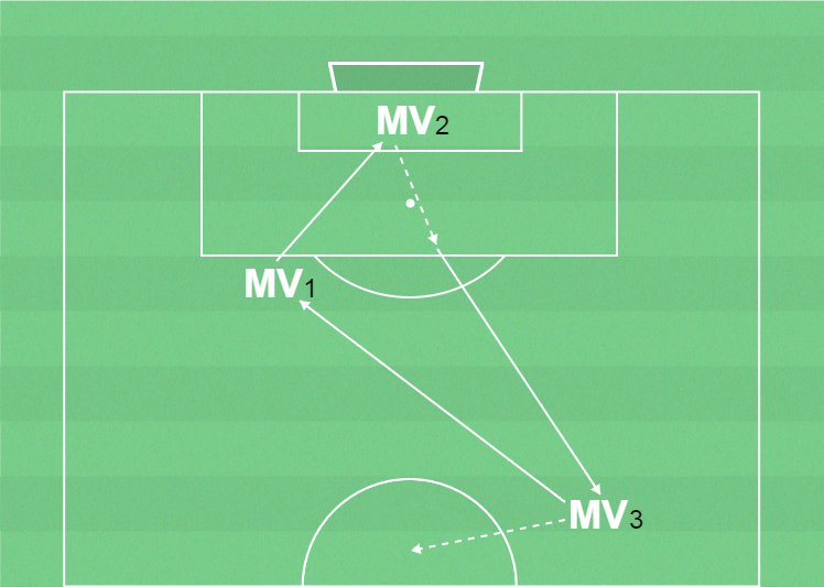 Mv3 tar emot bollen med fötterna och passar tillbaka bollen till Mv1.
