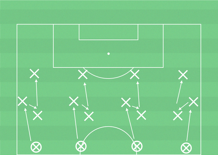 16 spelare, yta 35 x 60 meter, bollar och koner.