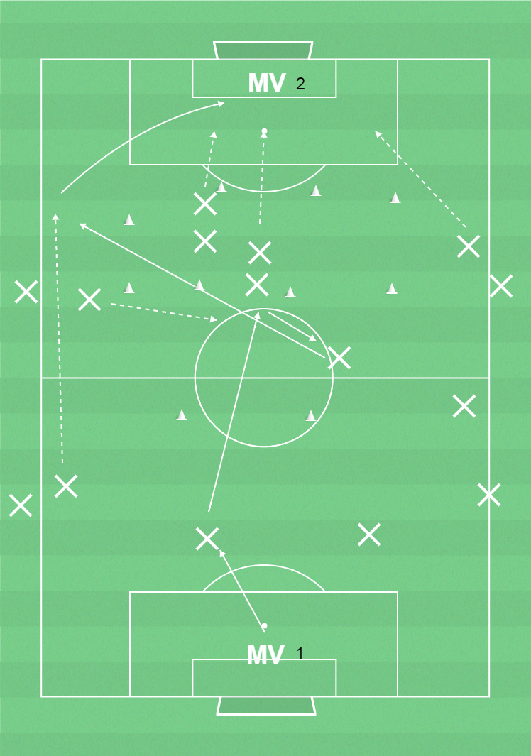 Mv1 spelar ut bollen till en av mittbackarna som spelar till felvänd forward. Central mittfältare ger speldjup bakåt för tillbakaspel.