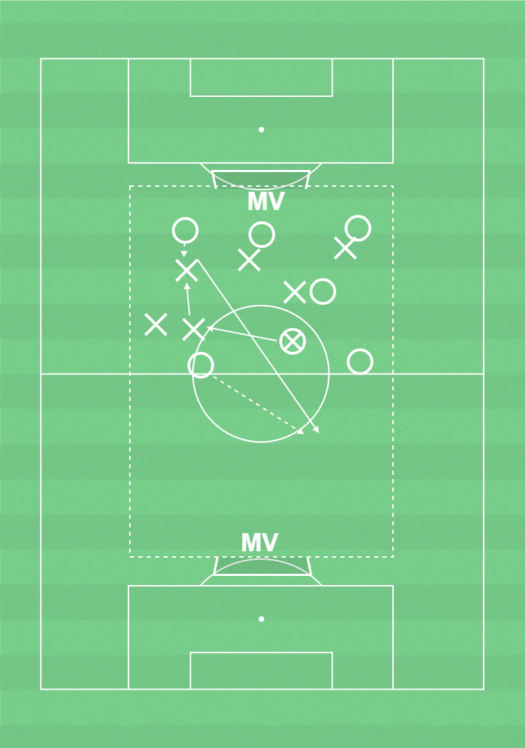 När lag O bryter ska laget med en direkt passning nå sin forward som löper in i spelyta 3.