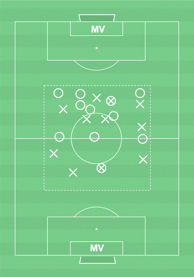 När lagen passat till motståndarnas målvakt återgår man till den centrala ytan och upprepar övningen.