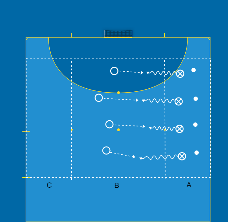 Det är inte tillåtet att passa bollarna. Driver anfallande spelare ut bollen utanför ytan så får försvararen bollen att lägga i sin zon. Driver försvarande spelare ut bollen så får anfallande spelare börja om med bollen i zon A.