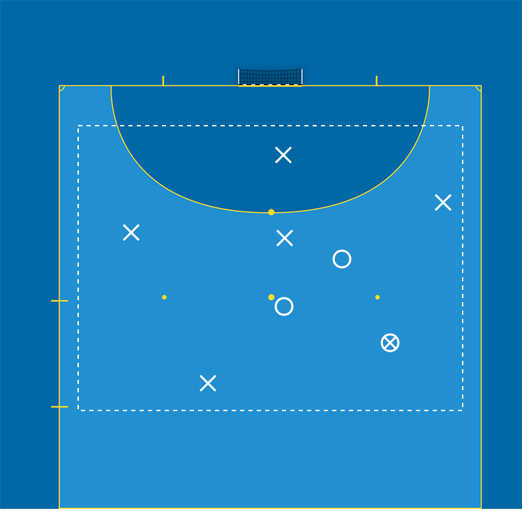 Sex spelare har två bollar som de passar till varandra. Två spelare är passiva försvarare och ska täcka bort anfallsspelarna som inte har boll.