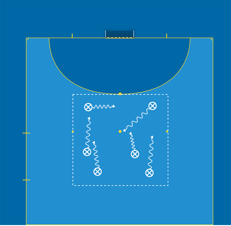 Ca 6 spelare, bollar, yta 10x8 (ca), koner och västar. Anpassa storlek efter antal spelare, dock inte för stort.