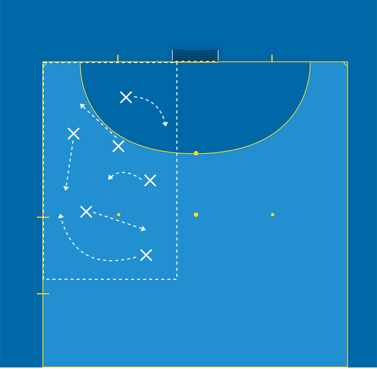 Ca 6 spelare, yta ca 15 x 8 meter och koner.