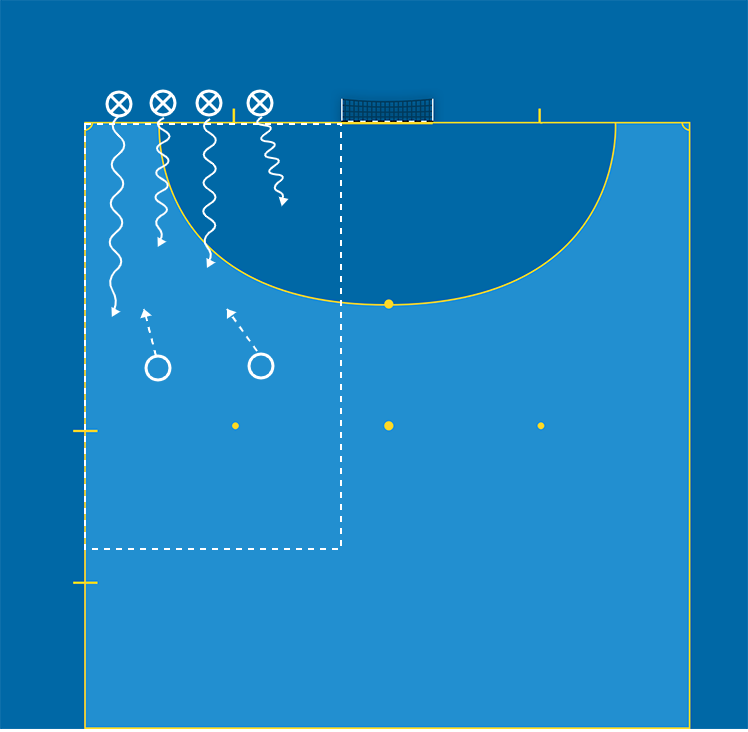 Ca 6 spelare, yta 10-12x7-8m och bollar.