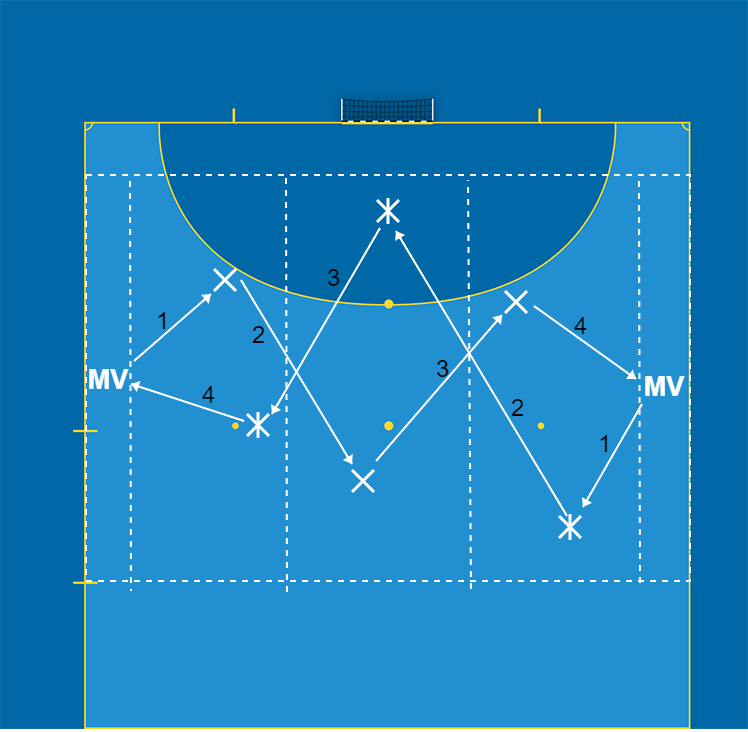 Dela in spelarna i två lag med tre spelare i varje lag. En målvakt (utespelare) står på varje kortsida som agerar vägg och är med båda lagen. Lagen har en varsin boll. Planen delas in tre lika stora delar, en spelare per lag i varje zon. Uppgiften för spelarna är att spela bollen från MV till MV via spelarna i de olika zonerna.