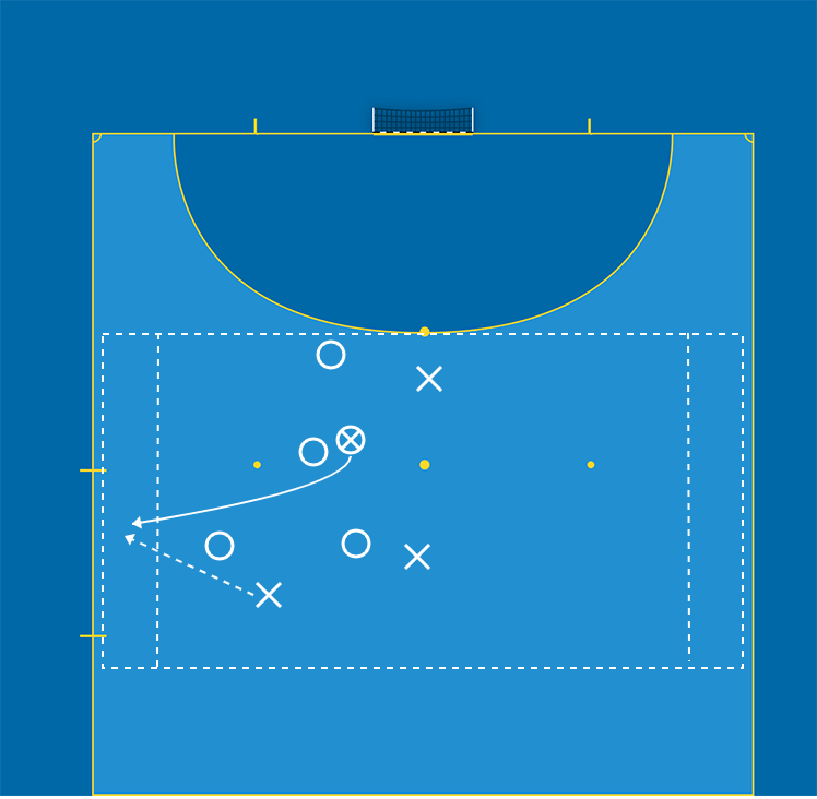 Spelarna delas upp i två lag. Övningen går ut på att spelarna kastar bollen till varandra och tar sig framåt för att göra mål. Mål görs genom att man kastar bollen till en spelare som befinner sig i målområdet. Spelarna får inte springa med bollen och de måsta doppa bollen i golvet varje gång innan de passar bollen. Försvarande spelare får inte slå bollen ur händerna på den som har bollen.