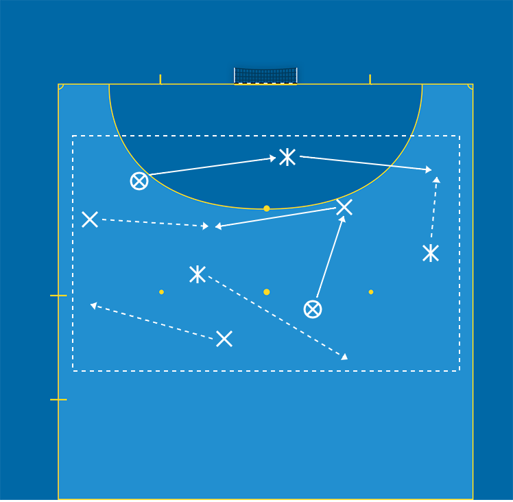 Spelarna delas in i två lag med fyra spelare i varje lag. Lagen har en varsin boll som spelarna passar till varandra. Efter passning ska passningsläggaren göra high five med en spelare i det andra laget.
