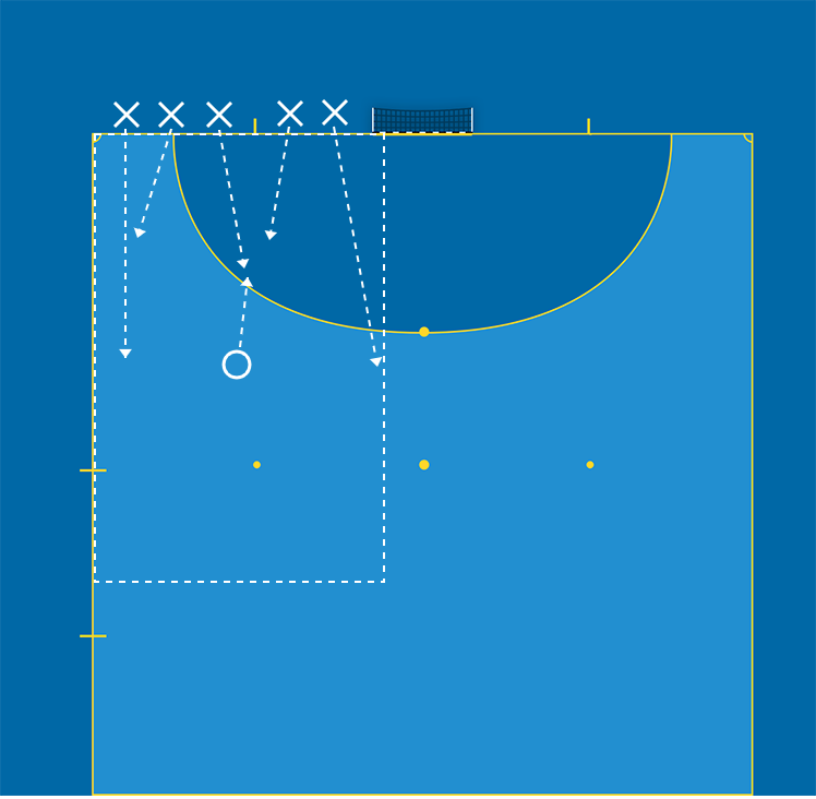 Ca 6 spelare, yta 15 x 8 meter och västar.