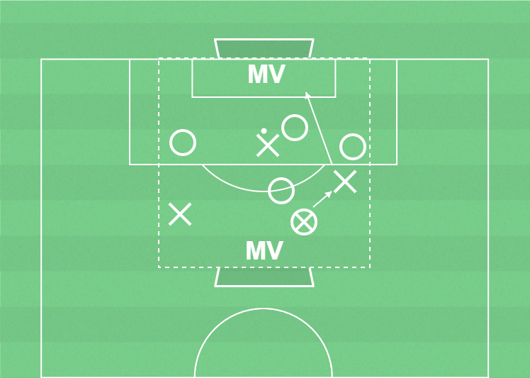 När laget har bollen på egen planhalva kan laget spela bollen till sin forward som gör tillbakaspel eller vänder upp och skjuter.