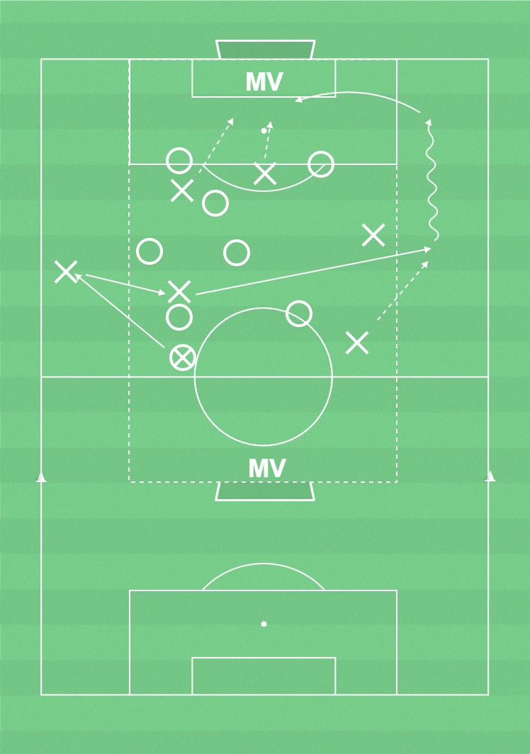 Spel 7 mot 7 med målvakter i den centrala delen av planen.