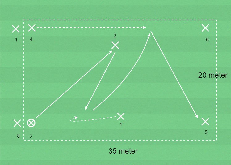 8 spelare, yta 35 x 20 meter, bollar och koner.