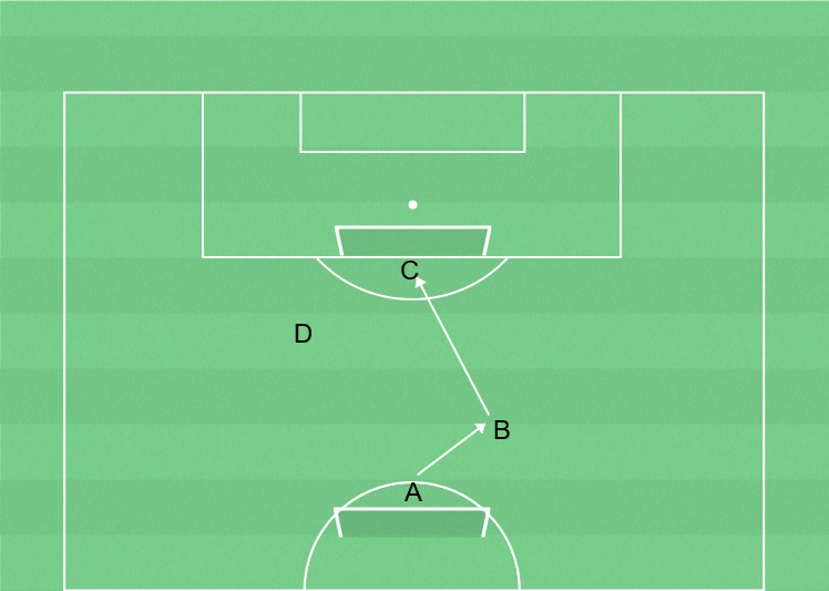 Målvakt C rullar ut till D som skjuter mot målvakt A.