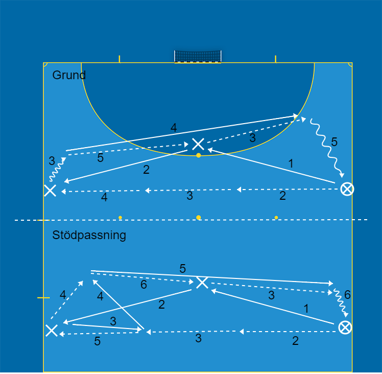 När vinge 2 får bollen från liberon så kommer vinge 1 i mitten och får en passning av vinge 2. Vinge 2 rör sig hemåt/inåt i planen och får en passning tillbaka från Vinge 1.