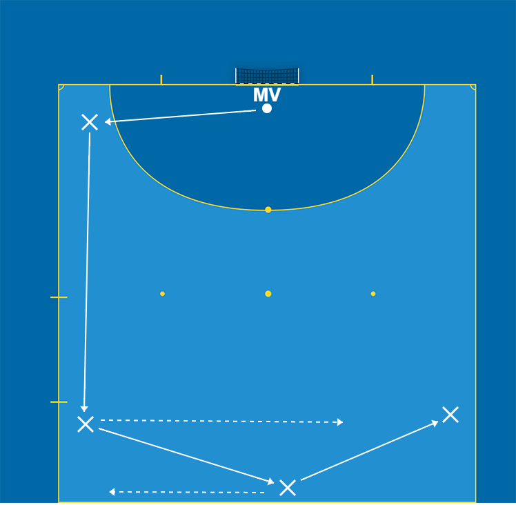 Fyra spelare ställer upp - en libero, två vingar och en pivot. Vingarna på varsin kant, liberon centralt med lite djup bakåt och pivot nere i ena hörnet. Målvakt startar med bollen och rullar ut till pivot. Laget tränar sen på olika varianter för att komma till avslut och göra mål.
