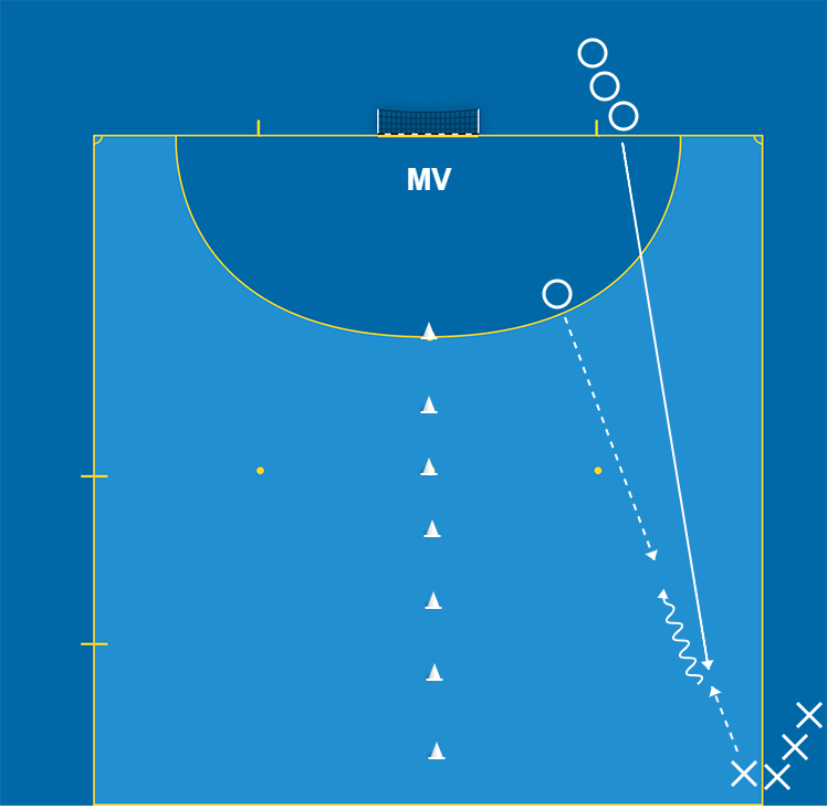 Ytan som används är en fjärdedel av planen, vilket innebär 20m i djupled och 10m i sidled. Spelarna delas upp i två led, ett med anfallsspelare och ett med försvarsspelare, där det anfallande laget placerar sig vid sidlinjen i höjd med mittlinjen och det försvarande laget placerar sig nere på kortlinjen med bollarna.