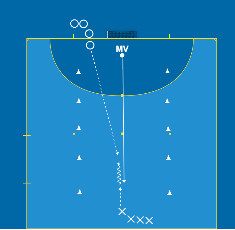 Målvakten sätter i gång spelet genom att kasta eller rulla till anfallsspelare. Samtidigt som bollen är på väg till anfallaren springer en försvarare ut. Anfallarens uppgift är göra mål, medan försvararen och målvakten skall förhindra det. Vinner försvararen bollen eller om målvakten räddar så ska de ställa om och försöka driva upp bollen över halva plan.