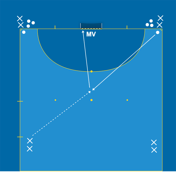 Spelarna delas upp i fyra led, två led uppe vid mittplan och två led nere på kortlinjen. Spelarna på kortlinjen turas om att spela upp en diagonal boll till spelarna i leden uppe vid mittplan.