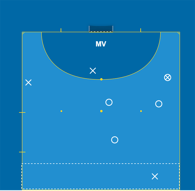 Målvakten rullar ut bollen och anfallsspelarna skall spela upp bollen till lagets pivot i målzonen eller driva in bollen i målzonen. Målvakten får rulla ut bollen till valfri spelare, även spelaren i målzonen.