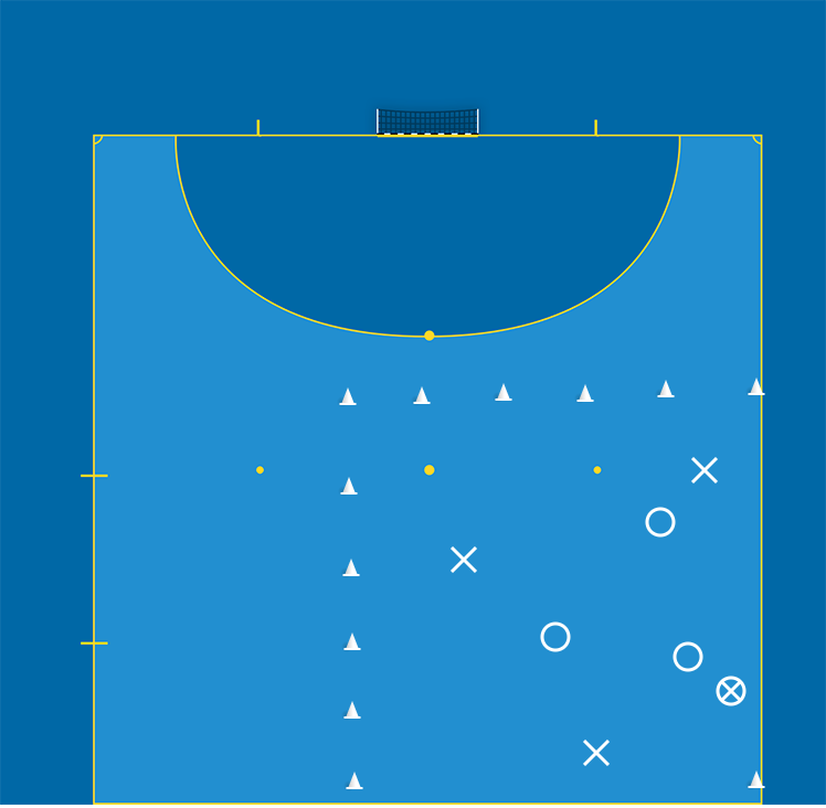 7 spelare, spelplan ca 15 x 12 meter, bollar och västar.