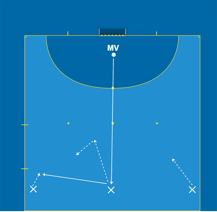 Spelarna är fördelade på tre led vid mittlinjen. Målvakten rullar ut bollen till valfri spelare. Spelaren som får bollen passar till någon av de andra för att sen bli försvarare. Spelaren som får passningen ska tillsammans med tredje ledets första spelare komma till avslut och göra mål i en 2 mot 1-situation.