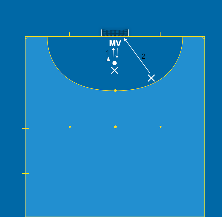 MV3 avslutar mot Mv1 som räddar med: splitträddning om bollen kommer längs golvet och palmning om bollen kommer i luften.