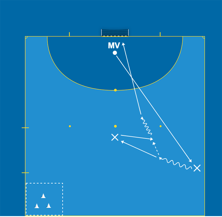 Mv1 har sin utgångsposition mitt i målet något framför mållinjen. Mv2 har sin utgångsposition vid mittlinjen och nära sidlinjen. Mv3 placerar sig cirka 10 meter framför målet. En kastzon med en kon finns på motståndarnas planhalva. Mv1 gör ett utkast och strävar efter att träffa konen i kastzonen. Mv1 gör en utrullning till Mv2 som tar emot och driver bollen och passar sen till Mv3 som passar tillbaka bollen till Mv2 som tar mot den och går på avslut.