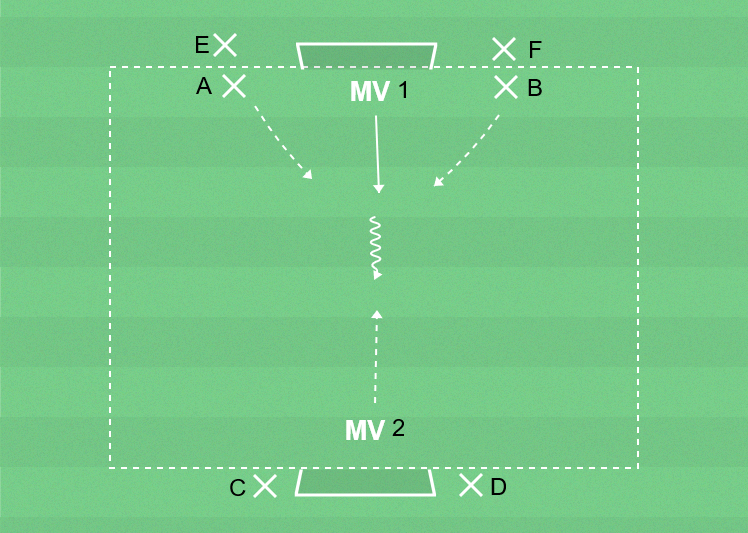 Spelare A ska avsluta mot målvakt 2 i friläge.