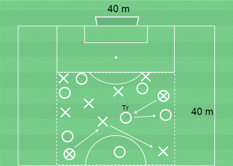 16 spelare, yta 40 x 40 meter, bollar, koner och västar.