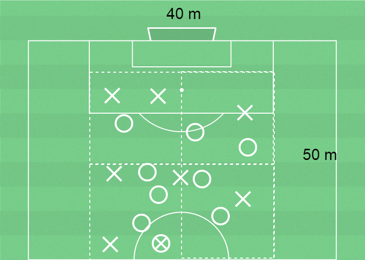 Lag X ska förhindra att lag O kan spela ut bollen från rektangeln där de erövrade den.
