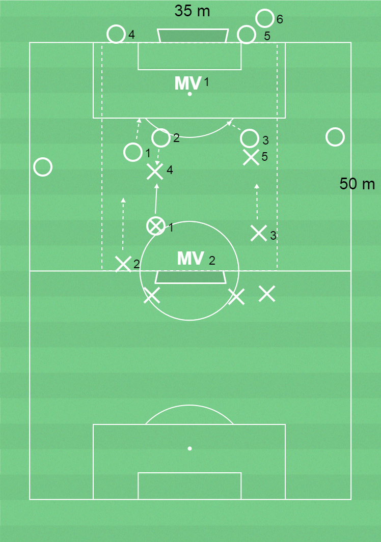 X1–X5 anfaller mot O1–O3 och Mv1 – spel 5 mot 3.