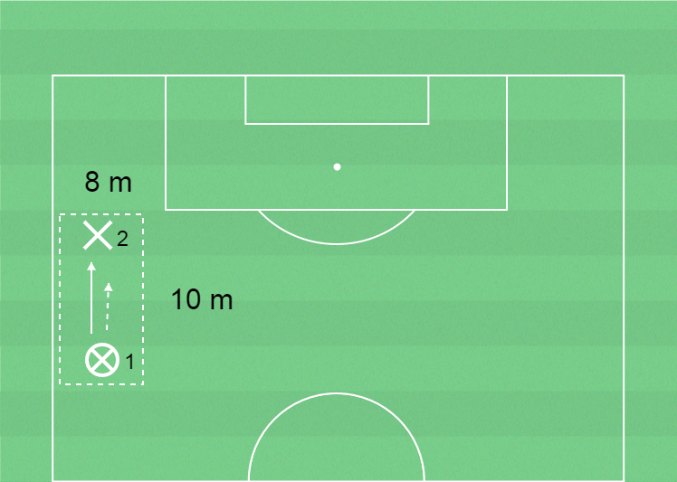 2 spelare, yta 10 x 8 meter, bollar, koner och västar.