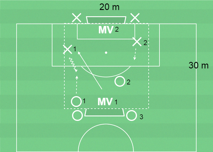 2 målvakter, 8 utespelare, spelplan 30 x 20 meter med 2 mål, bollar, koner och västar.