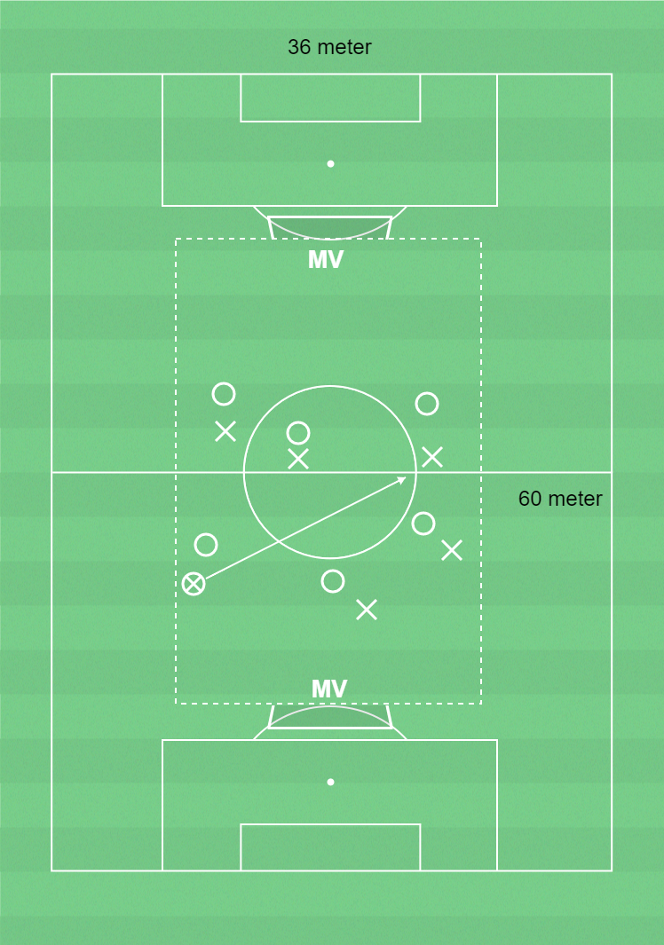 2 målvakter, 12 utespelare, spelplan 60 x 36 meter med 2 mål, bollar, koner och västar.