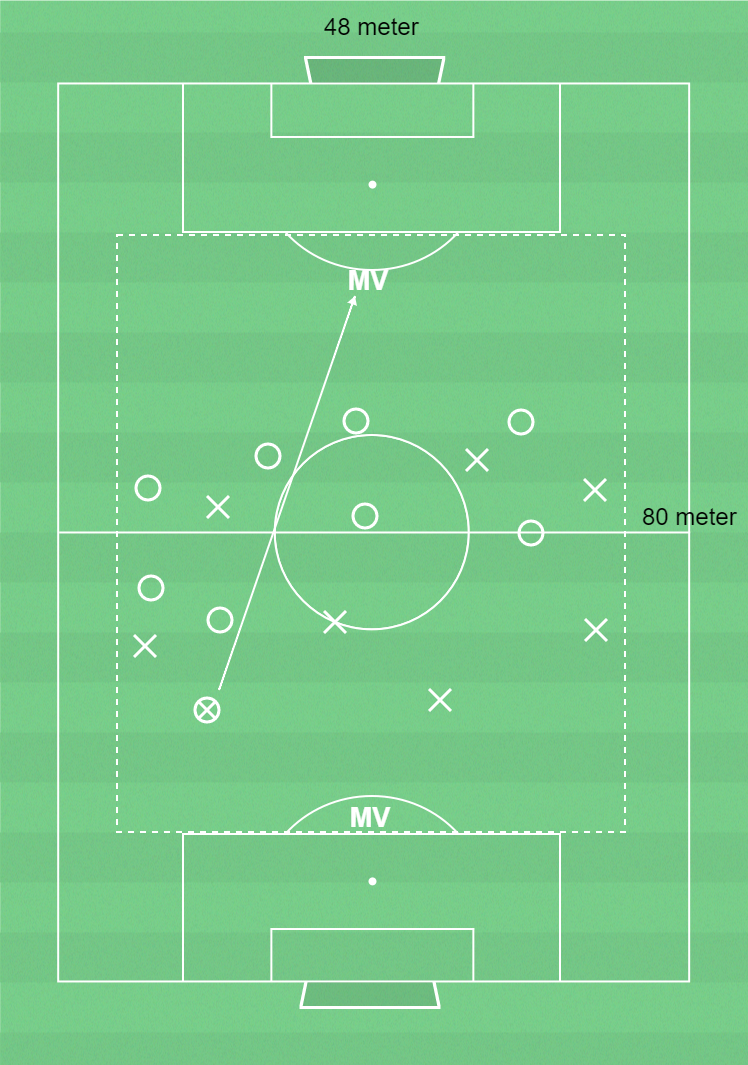2 målvakter, 16 utespelare, spelplan 80 x 48 meter, bollar, koner och västar.