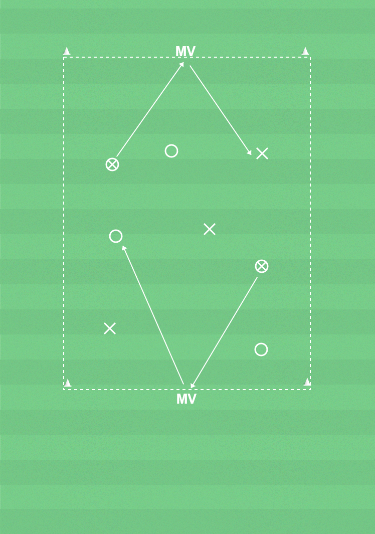En boll och fritt spel i mitten. Poäng om laget spelar bollen från den ena målvakten till den andra utan att motståndarna bryter.