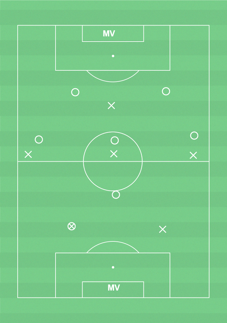 Spelare, boll, västar, koner, mål.
