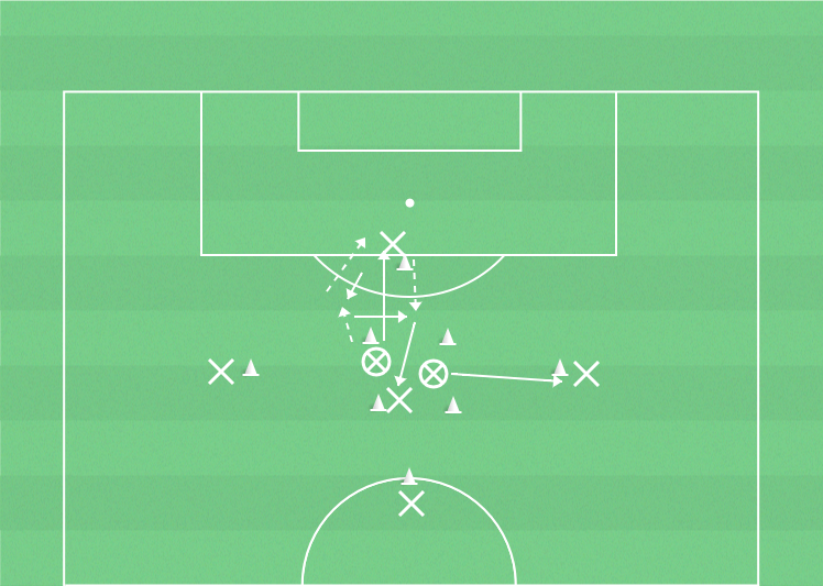 4 spelare utanför kvadraten, 3 spelare inne i kvadraten, två av dom med boll.