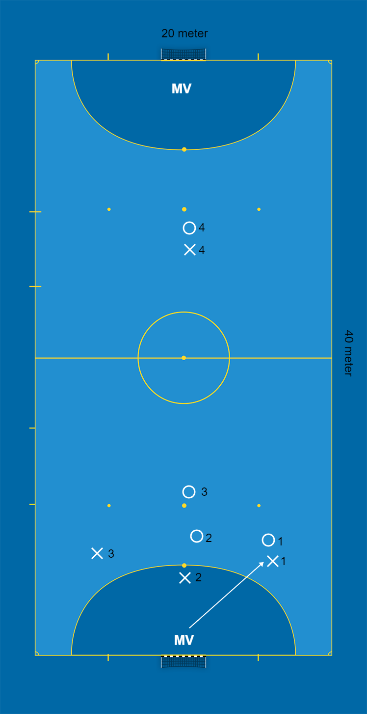 De 3 försvarsspelarna ska förhindra att bollen spelas till motståndarnas pivot. Om det försvarande laget erövrar bollen får laget försöka komma till avslut.