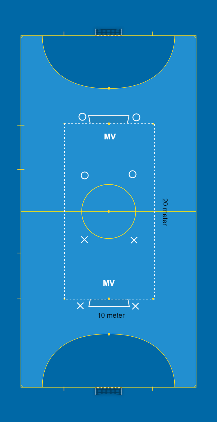 2 målvakter, 8 utespelare, spelplan 20 x 10 meter med 2 mål, bollar, koner och västar.