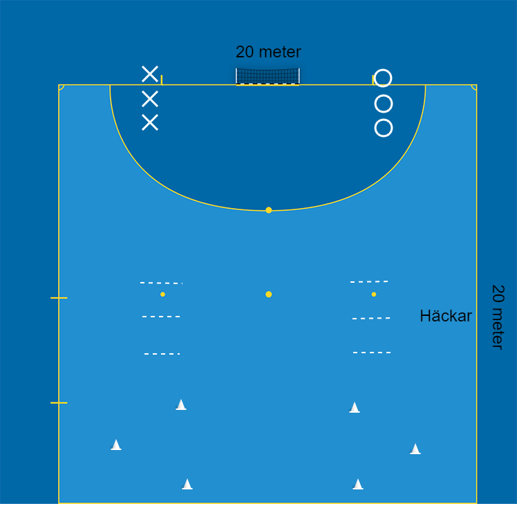 Placera koner och häckar enligt figuren och dela in spelarna i 2 lag för stafett.