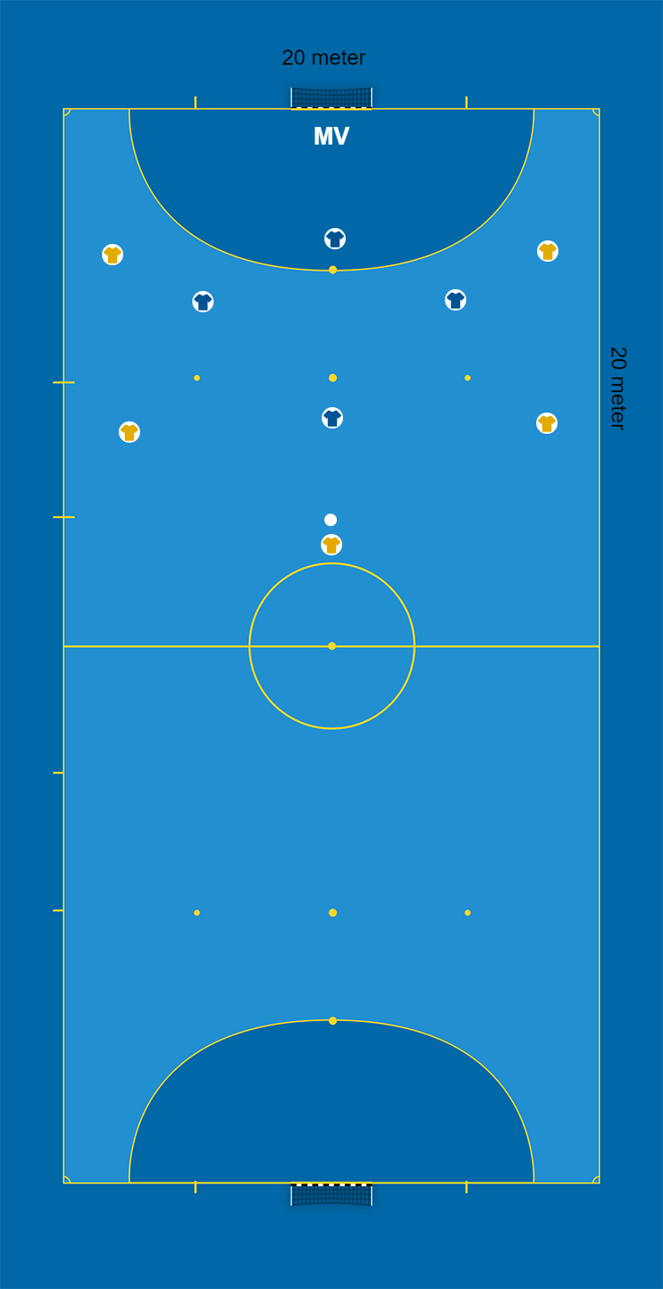 1 målvakt, 9 utespelare, spelplan 20 x 20 meter med 1 mål, bollar, koner och västar.