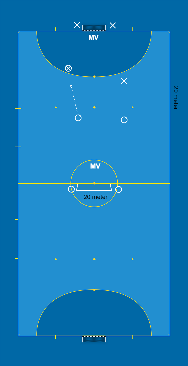 2 målvakter, 8 utespelare, spelplan 20 x 20 meter med 1 mål, bollar, koner och västar.