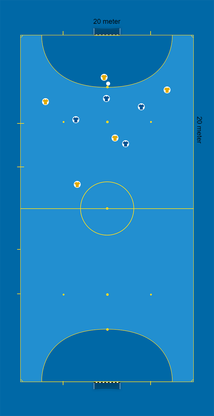 Gult lag håller bollen inom laget, och blått lag försöker erövra bollen.