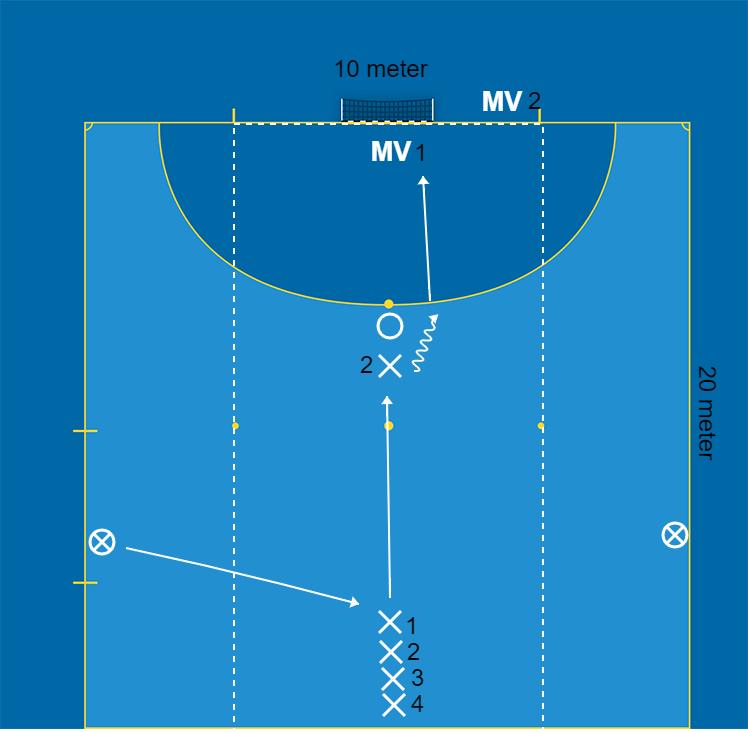 En av vingarna passar till den förste spelaren i ledet. Denne passar till pivoten som vänder bort en passiv försvarsspelare och avslutar.