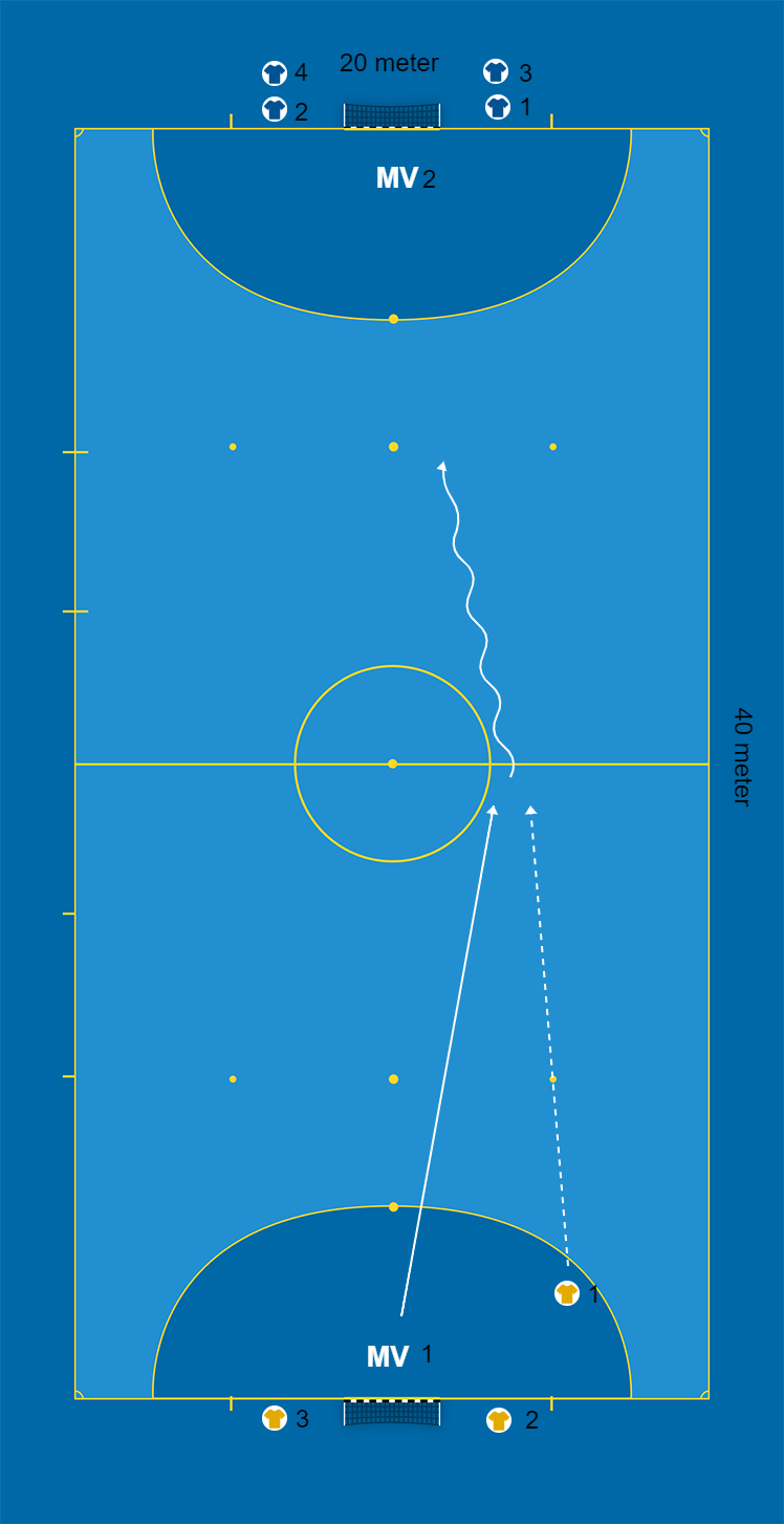 2 målvakter, 7 utespelare, spelplan 40 x 20 meter, bollar, västar och koner.