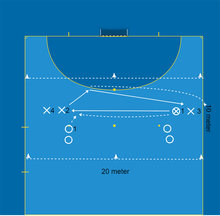 8 spelare, yta 10 x 20 meter, bollar och västar.